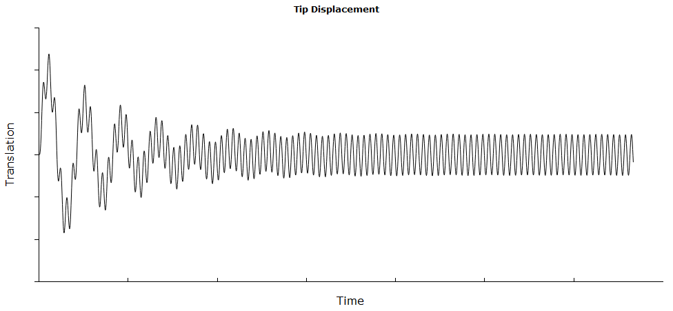 The following images show the structural response as an animation as well as a graph of the tip-deflection of a simple beam-structure. The first mode of this beam mesh is at about 8Hz. A sine-wave at 50Hz is applied, starting at 0s with the beam initially in rest. The sudden start of the applied sine-wave load adds energy to the structure over a wide frequency range. Since the 50Hz load is close to the second mode at 51Hz, the deformed shape closely resembles the second mode. However, the first mode at 8Hz is superimposed on the response in both the animation and the graph.