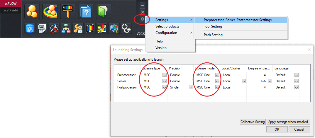 To access the license settings, from the Cradle Kicker, click on the Gear icon, followed by Settings > Preprocessor, Solver, Post Processor Settings as shown in the next image.