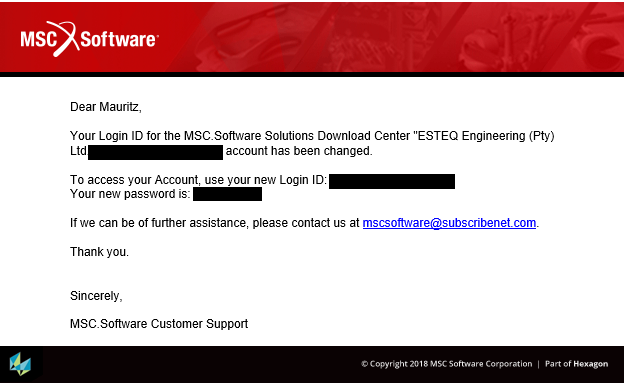 Once your MSC account administrator has create an account for you, you should get an email similar to the one shown in Figure 1. These login details can now be used to login to the MSC Software Solutions download center as shown in Figure 2.