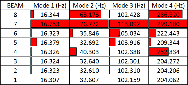 When comparing the calculated natural frequencies below, it shows a clear indication of which beams have the same stiffness as beam 1 (in my opinion the most accurate answer) and which ones produced an answer the furthers from it (beam 7).