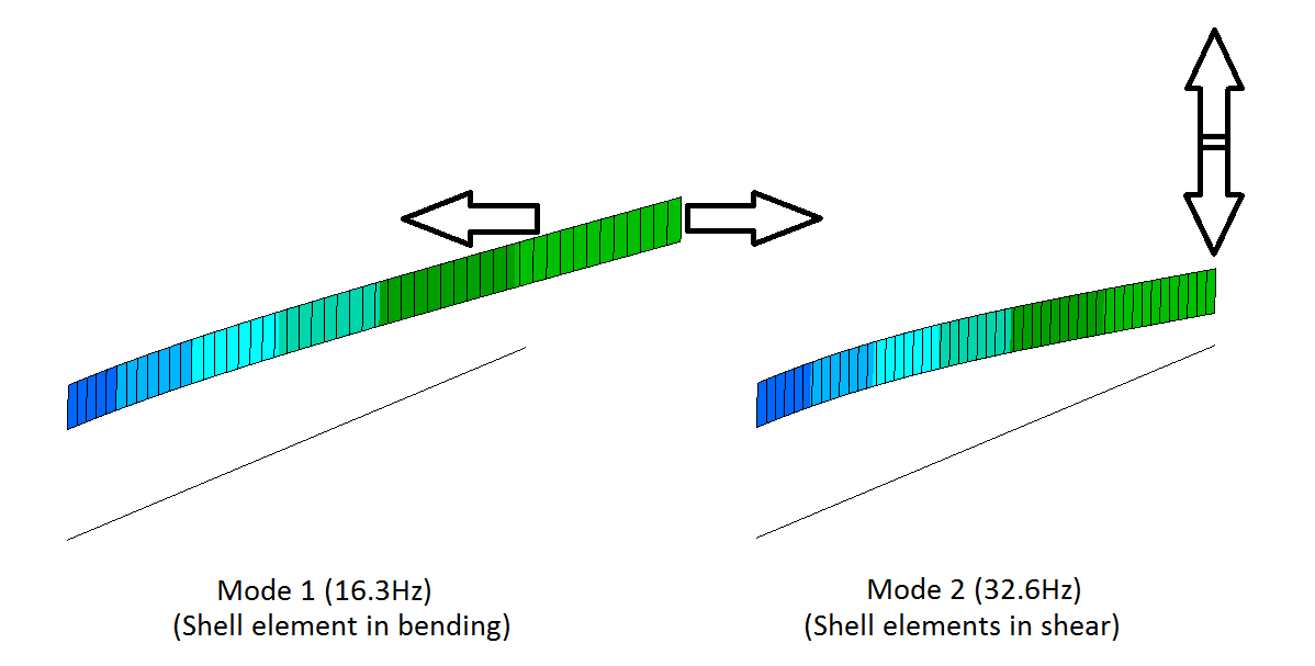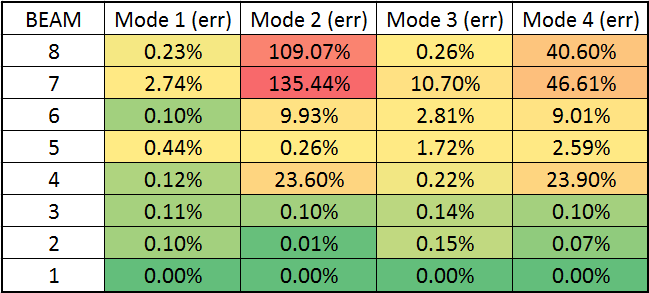 As a baseline, I chose beam elements (beam 1) and used Nastran's CBEAM element formulation with the coupled mass method to reduce approximation inaccuracies.