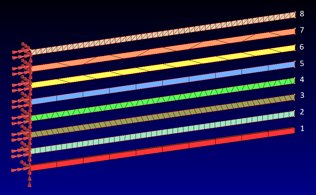 Eight cantilevered beams of the same dimensions and material but using different element shapes and formulations