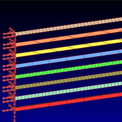 In this model all the beams were evaluated simultaneously and they showed a consistent first mode of bending around the thinnest dimension (width) as displayed below left and a second mode of bending about the vertical (height) dimension on the right.