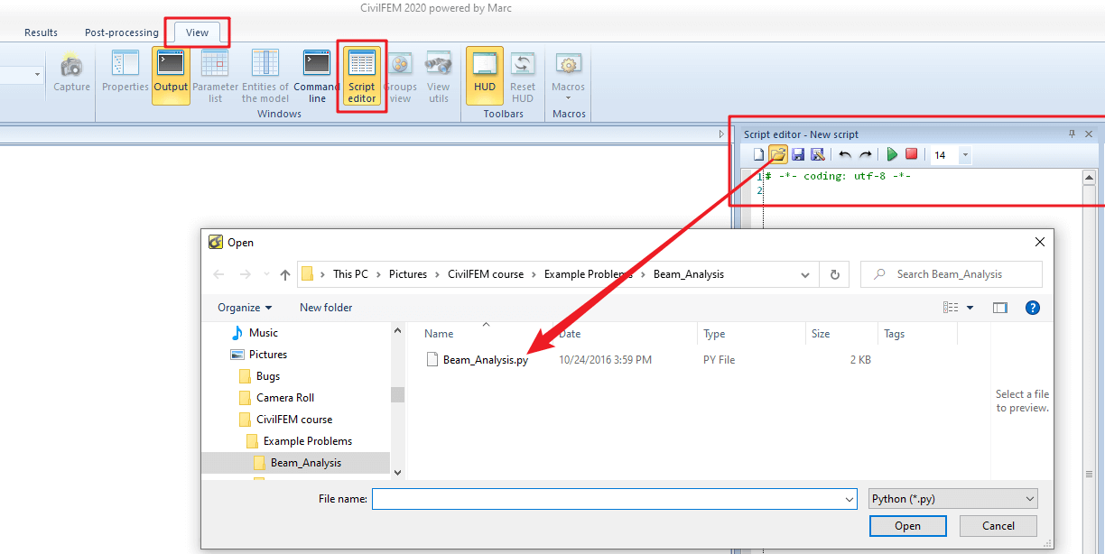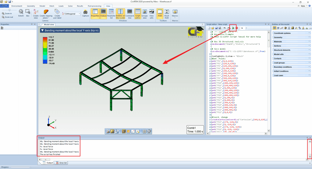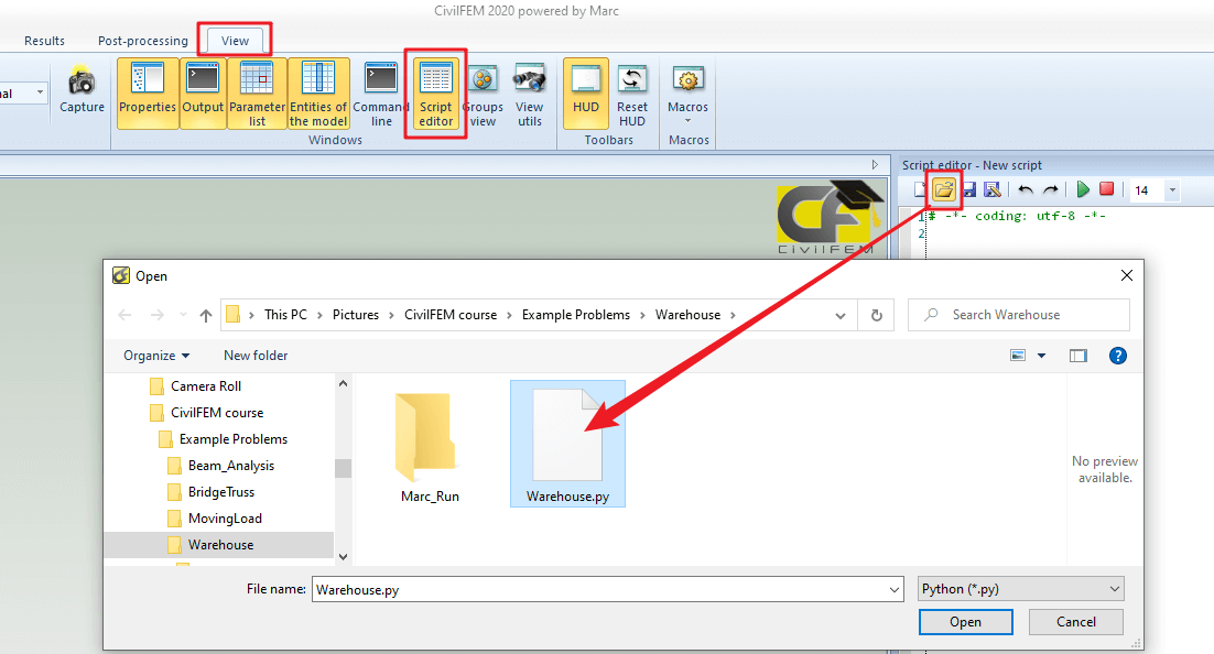 Display the Script editor (option under the View tab) and open the Warehouse.py script as shown below: