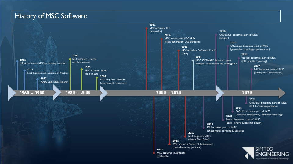 MSC Software was founded in 1963 by Dr Richard Macneal and Robert Schwendler, the pioneers of utilizing digital technologies to solve engineering challenges. At the time, they were deeply invested in the efforts to improve early finite element analysis (FEA) technologies for the aerospace industry. NASA’s request for a general-purpose structural analysis tool was a key fulfilment of MSC Software in 1965, which became known as NASTRAN (NASA Structural Analysis). Many other technologies were pioneered by the company and reliance upon the technology grew for analysing and predicting stress, strain, vibration, acoustics and thermal applications. MSC Software became one of the original 10 software companies with the first commercial version of MSC Nastran released in 1971.