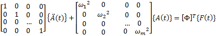 With mass scaling, the terms on the diagonal of the stiffness matrix becomes the square of the mode-shapes’ natural frequencies (with the frequency in radians/s). If we temporarily neglect damping, then the modal-dynamic equation becomes: