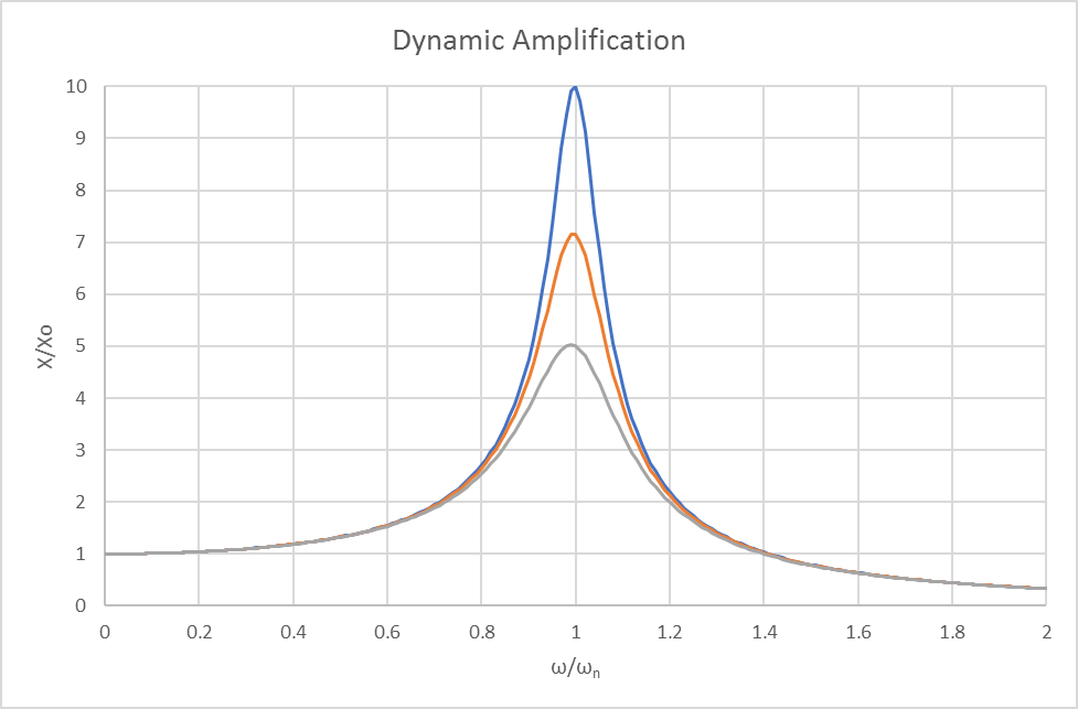 The following figure is for a single DOF spring-mass-damper system and plots the response for the displacement due to a load applied at some frequency relative to the displacement when the load is statically applied (i.e. the Dynamic Amplification). The ratio
