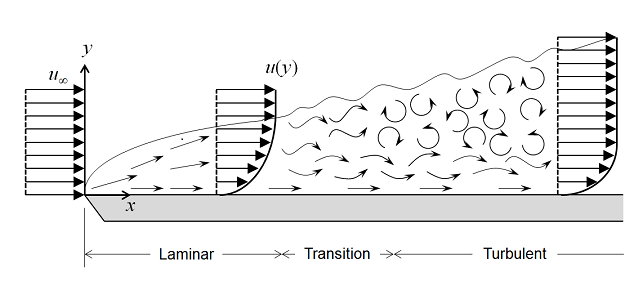 A boundary layer is created anywhere where a moving fluid meets a no-slip wall. The boundary layer is created because the velocity at the no-slip wall is 0 m/s and it increases to the free stream velocity as it moves further away from the no-slip wall. The boundary layer and velocity profiles for the different flow types is illustrated in Figure 2. For the purpose of this blog post we will specifically look at the turbulent boundary layer.