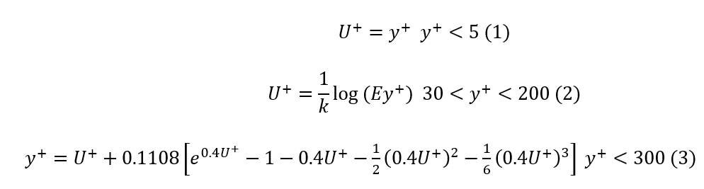 Equation 1 or 2 can be used as is but it will give very inaccurate results for certain y+ ranges as can be seen in Figure 1, this is why in most cases Equation 1 and 2 are combined in CFD codes using a simple IF statement (Equation 4). Equation 3 is also implemented in some CFD codes but because you cannot isolate U+ in Equation 3 you would have to iterate to obtain a value for U+ . This can quickly become a very expensive computational exercise as the iteration process has to be performed at least once for every cell where the velocity needs to be calculated using a wall function per cycle.