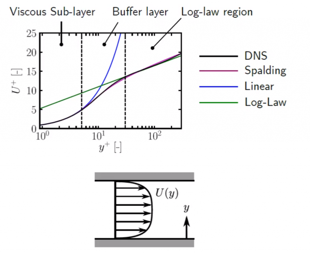 Wall functions are derived from empirical data that was measured from flow between 2 flat plates as showed in Figure 1. The DNS (Direct Numerical Simulation) fits the experimentally measured data almost exactly but this is an expensive analysis to do, so in most cases a curve is fitted to the empirical data. Two curves are usually fitted to the empirical data, a linear curve (Equation 1, blue curve in Figure 1), and log curve (Equation 2, green curve in Figure 1). A single polynomial curve can also be fitted to the empirical data. An example of a polynomial curve that fits the empirical data fairly accurately is known as the Spalding curve (Equation 3, purple curve in Figure 1).