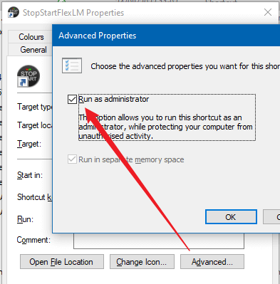 6) To ensure that the file runs as administrator (otherwise it won’t work), set the following property (right click the file and go to Properties > Shortcut > Advanced):