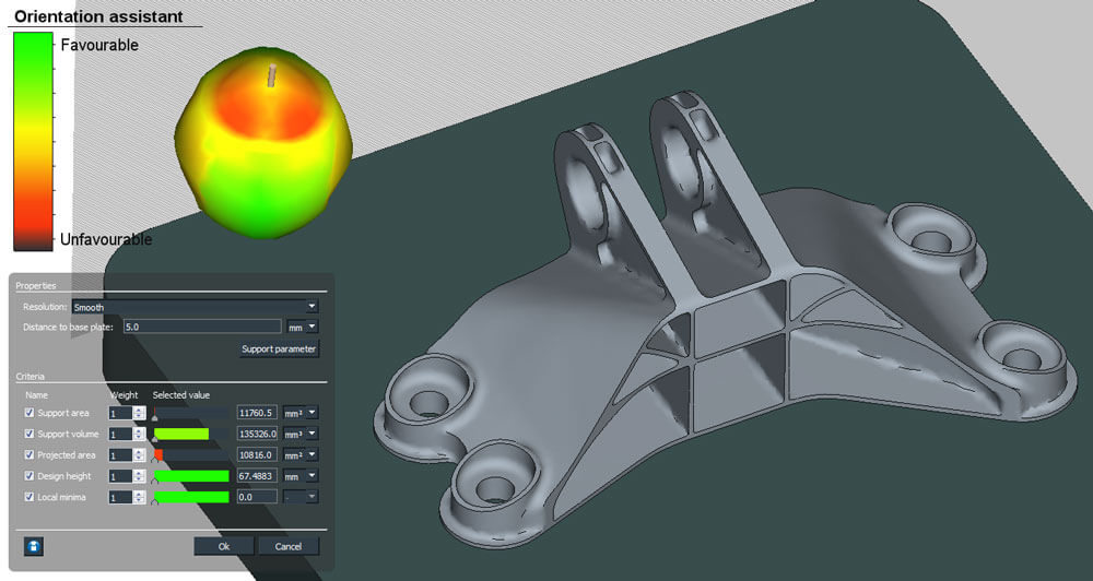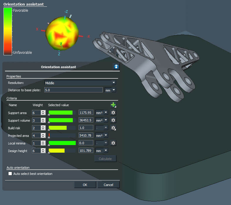 The Orientation Assistant is included to determine the best build orientation based of different criteria, including support area, support volume, cost, risk, projected area and design height. The user can define inputs and weigh preference according to requirements in order to optimize the build process. With the available material costs and energy consumption of the consumption parameters, Simufact Additive can estimate build time and the accompanying costs.