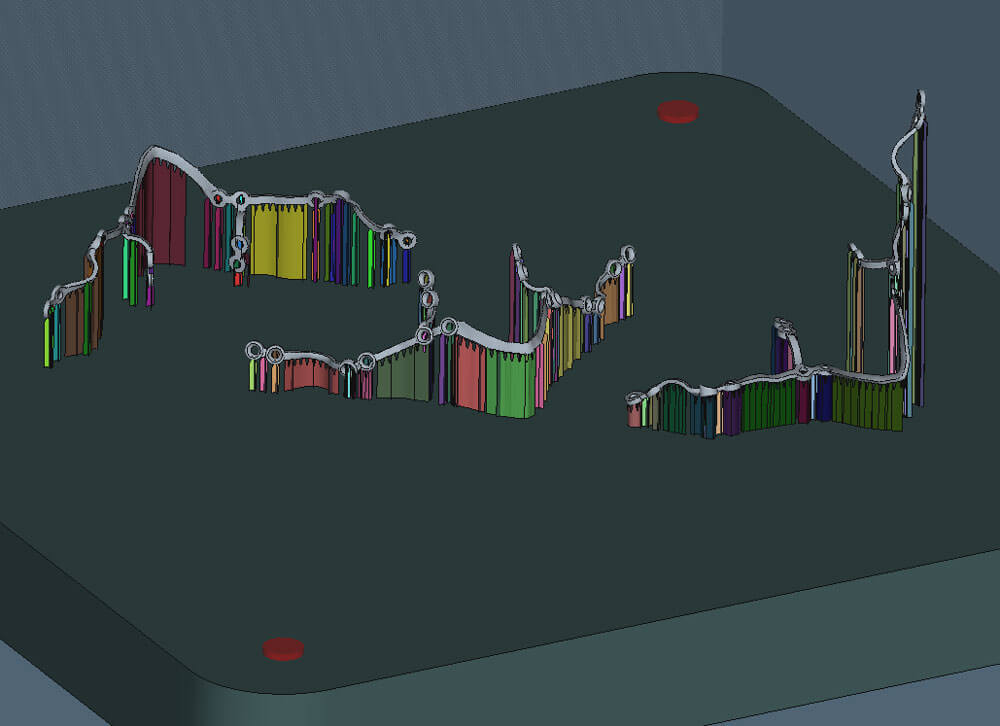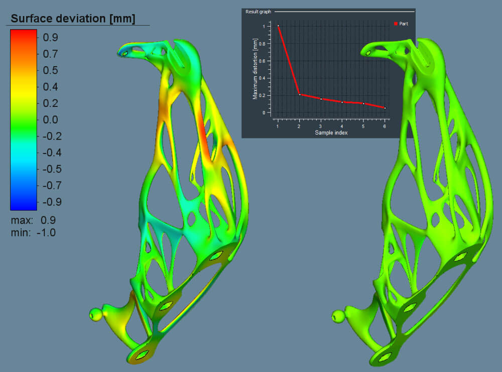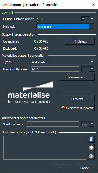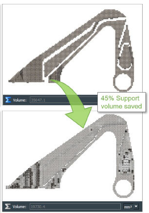 Simufact Additive allows the user between its embedded support generation algorithm, or also includes the algorithm of Materialize. The functionality offers the several options and input parameters such as the faces that need to be included or excluded, radii, distances and critical angles. Additionally, Simufact Additive provides different techniques to optimize parts and to simplify it. The Support Optimization feature helps the user to find the optimal support structure, saving material, build time and energy. The software compensate for distortions with multiple iterations to ultimately get desired trade-off between quality and build parameters.